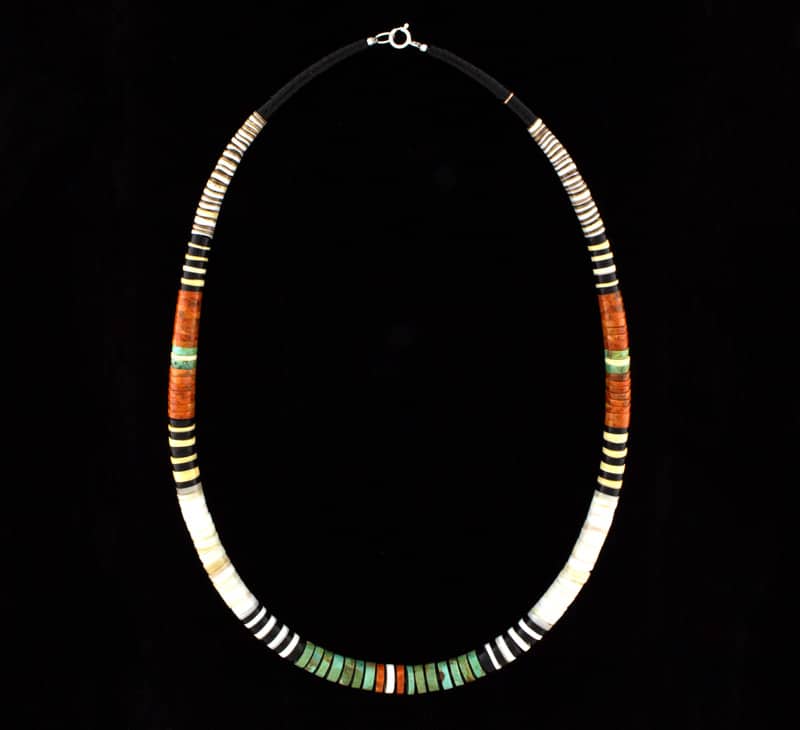 22" Length Graduated Multi-Color Stone & Shell Heishi Necklace Consisting of  Pennsylvania Black Jet, White Clamshell, Nevada Green Turquoise, Apple Coral And Gray Olive Shell.  NO IMITATION MATERIALS USED.  Exquisitely Handmade And Designed By Santo Domingo Pueblo Husband & Wife Artists GERARD & MARY L. CALABAZA.Artist Hallmark:  "C" (hand stamped on a small copper disc embedded between jet heishi at top of necklace)