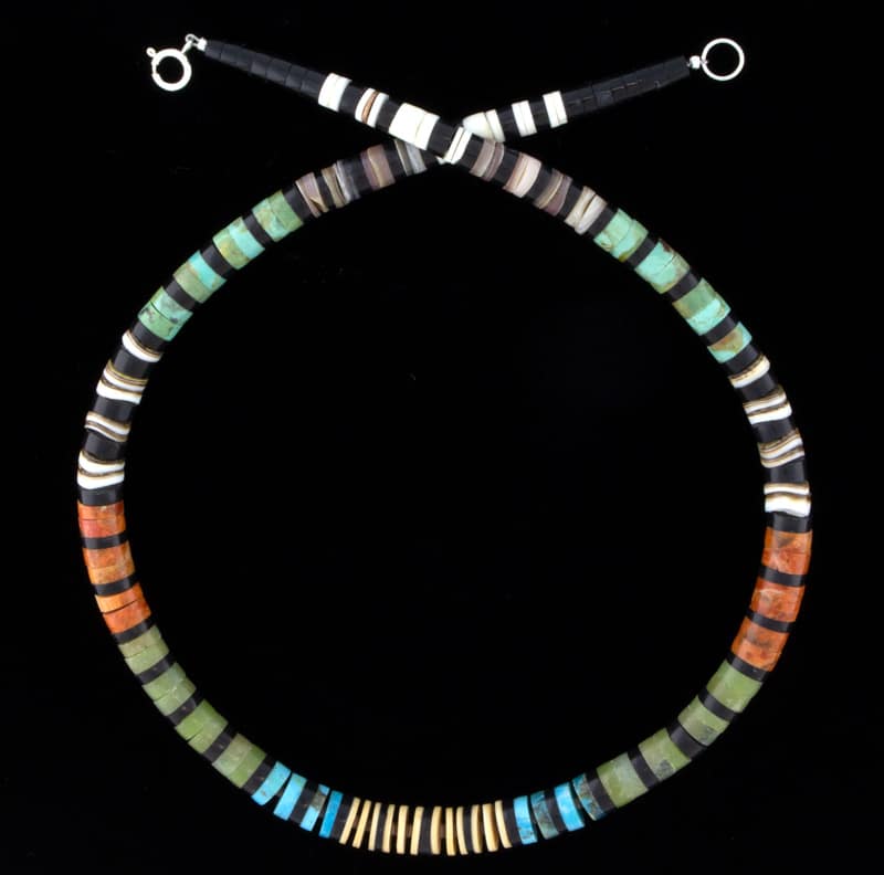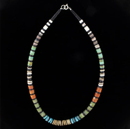 18" Graduated Exotic Multi-Color Stone & Shell Heishi Necklace Including Pennsylvania Jet, Thick White Clamshell, Pink Mussel Shell, Gray Olive Shell, Nevada Green Turquoise, Kingman Turquoise, Apple Coral, Apple Green Serpentine And White/Orange Melon Shell.  NO IMITATION MATERIALS USED.  Exquisitely Handmade And Designed By Santo Domingo Pueblo Husband & Wife Artists GERARD & MARY L. CALABAZA.