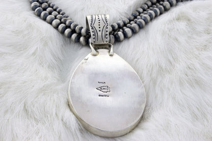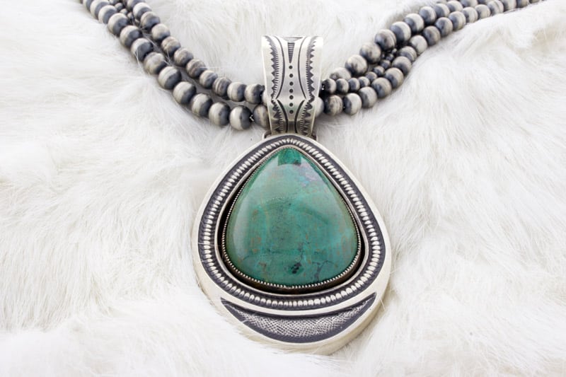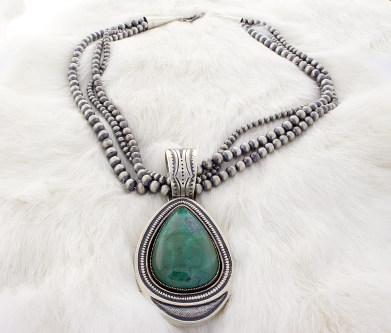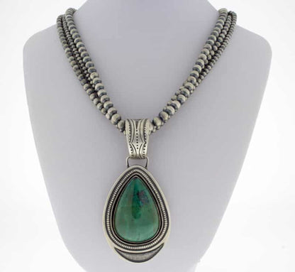 20" Length 3-Strand "Old Style" Sterling Silver Bead Necklace Featuring An "Old Style" Ingot Sterling Silver Pendant Set With A Gem Quality Natural Chrysocolla Stone Mined From The Bisbee, Arizona Pit. Necklace Masterfully Handmade And Designed By Navajo Artist JAN MARIANO. Pendant Masterfully Handmade And Designed By Navajo Artist CALVIN MARTINEZ. *Pendant and Necklace May Be Purchased Separately. Call or E-Mail For Pricing.