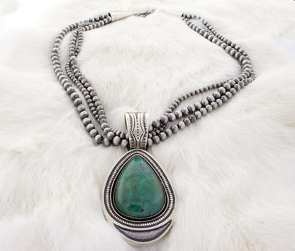 Handmade 3-Strand Sterling Silver Bead Necklace With Natural Chrysocolla Pendant
