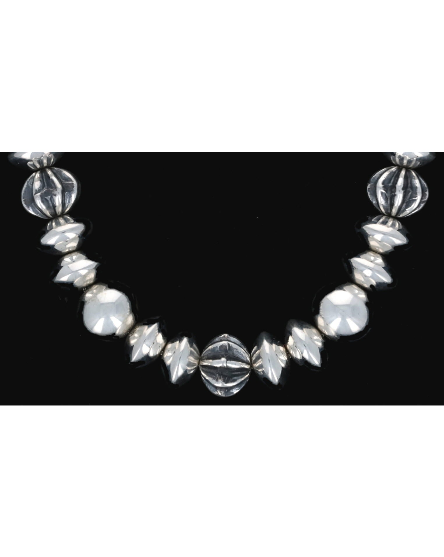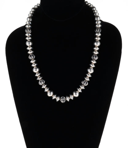 Exquisite 21" Length Sterling Silver Bead Necklace Stylized With Round, Saucer And Fluted Shaped Beads.  Masterfully Handmade And Designed By Navajo Artist BRYAN JOE.