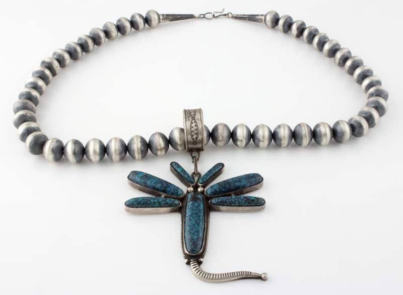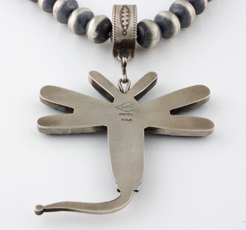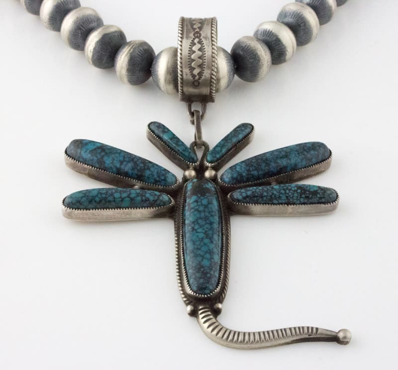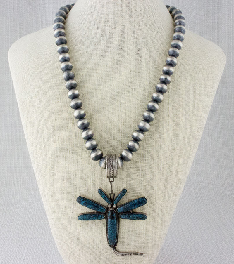 22.5" Length "Old Style" Sterling Silver Bead Necklace Featuring An Ingot Sterling Silver Dragonfly Pendant Set With 7 Natural China Mountain Turquoise Stones. Necklace Masterfully Handmade And Designed By Navajo Artist JEFFREY NELSON. Pendant Masterfully Handmade And Designed By Navajo Artist CALVIN MARTINEZ.