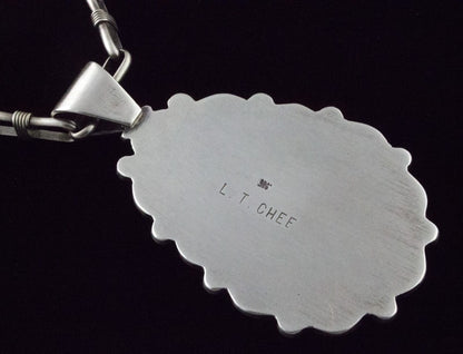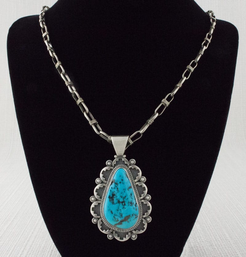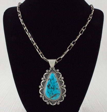 23" Length Sterling Silver Wire-Wrapped Link Chain Necklace Featuring An "Old Style" Sterling Silver Pendant Set With A Natural Kingman Turquoise Stone. Necklace Masterfully Handmade And Designed By Navajo Artist SALLY SHIRLEY. Pendant Masterfully Handmade & Designed By Navajo Artist LEONARD TOM CHEE.