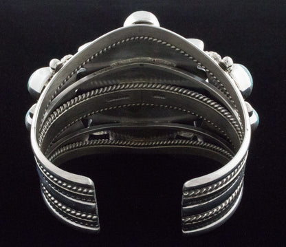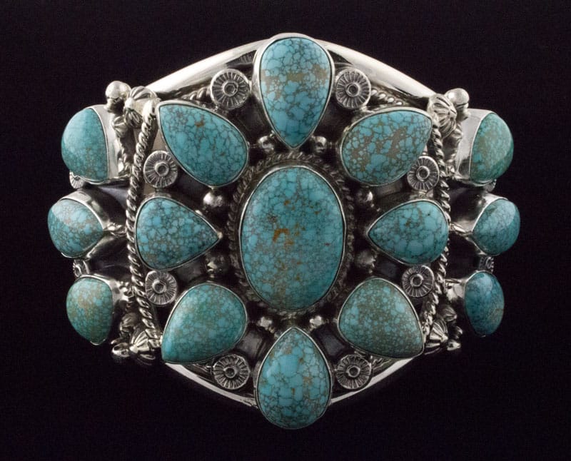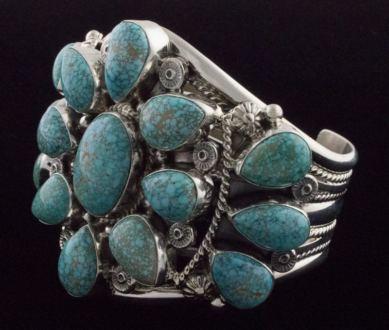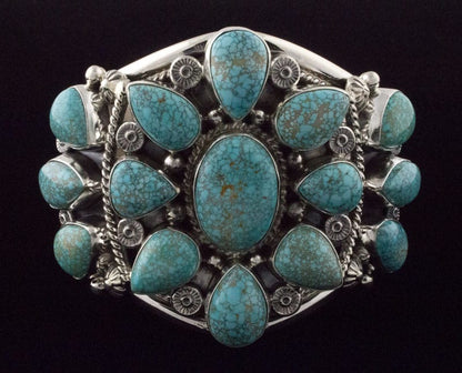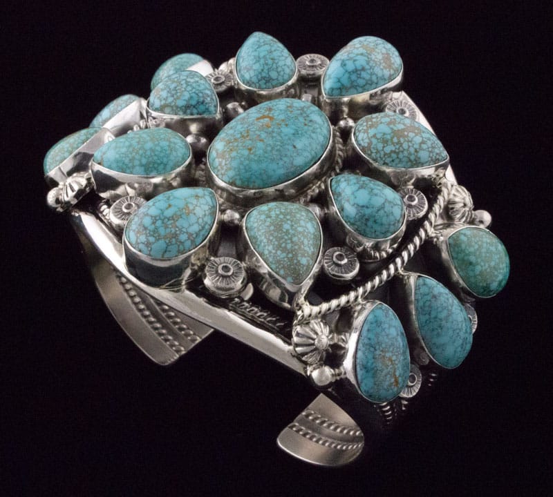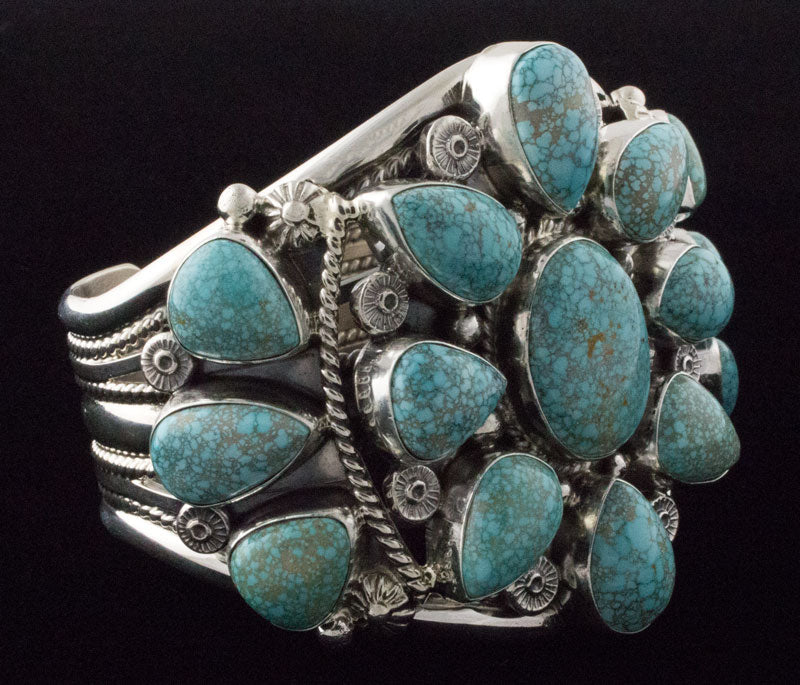 Sterling Silver Bracelet Set With A RARE Cluster Of 15 High Grade Natural #8 Micro-Web Turquoise Stones. Masterfully Handmade And Designed By Navajo Artist ELLA M. LINKIN.