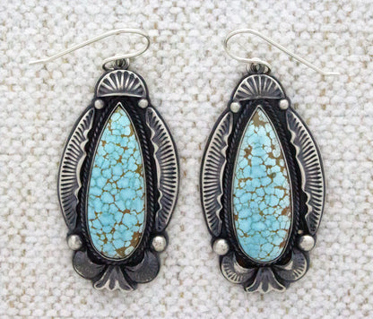 "Old Style" Sterling Silver French Wire Earrings Each Set With A Long Teardrop Shaped High Grade Natural #8 Turquoise Web Stone. Masterfully Handmade And Designed By Navajo Artist LARRY MARTINEZ CHAVEZ.