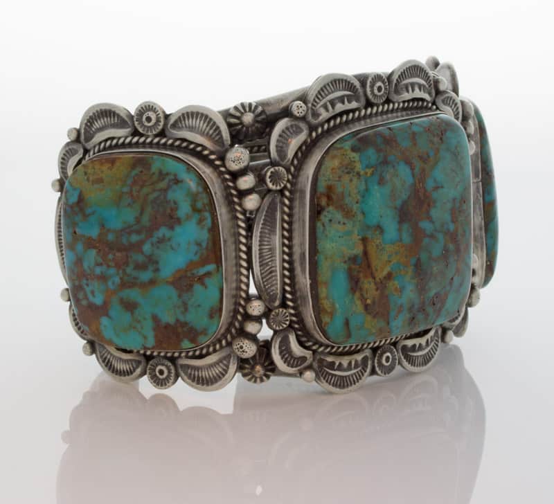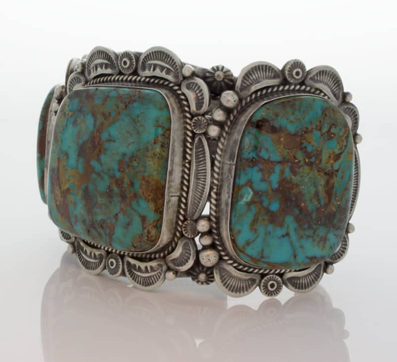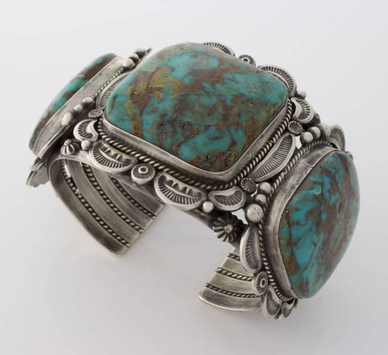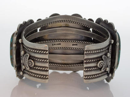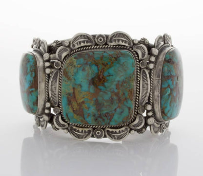 "Old Style" Sterling Silver Bracelet Set With 3 Impressive High Grade Natural Candelaria Turquoise Stones Mined Circa The Early 1970's.  All Stones Have A Combined Net Weight Of Approximately 170 Carats!  Masterfully Handmade And Designed By Navajo Artist ELLA M. LINKIN.
