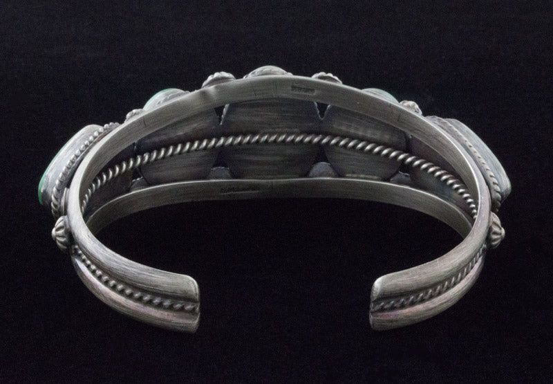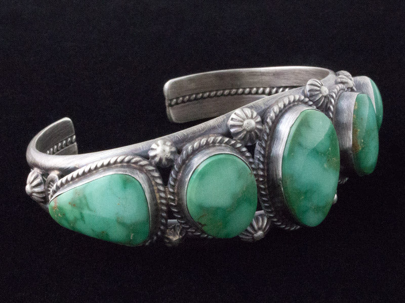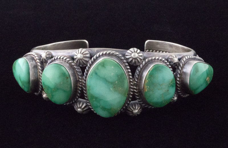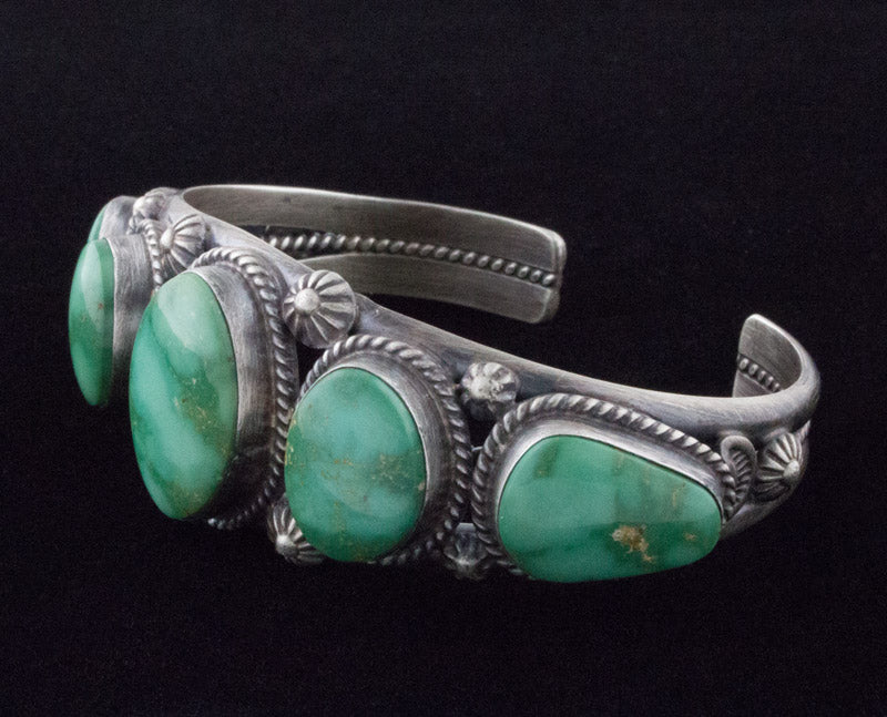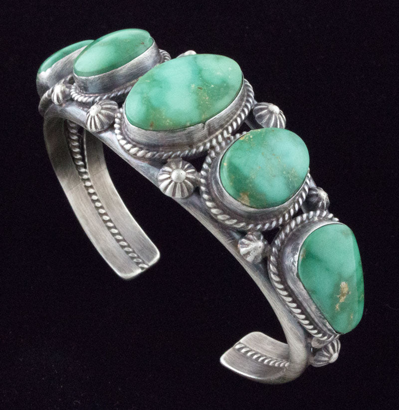 "Old Style" Sterling Silver Bracelet Set With A Row of 5 High Grade Natural Emerald Valley Turquoise Stones Mined Circa the 1970's Period. All 5 Stones Totaling 50 Carats. Masterfully Handmade And Designed By Navajo Artist ELLA M. LINKIN.