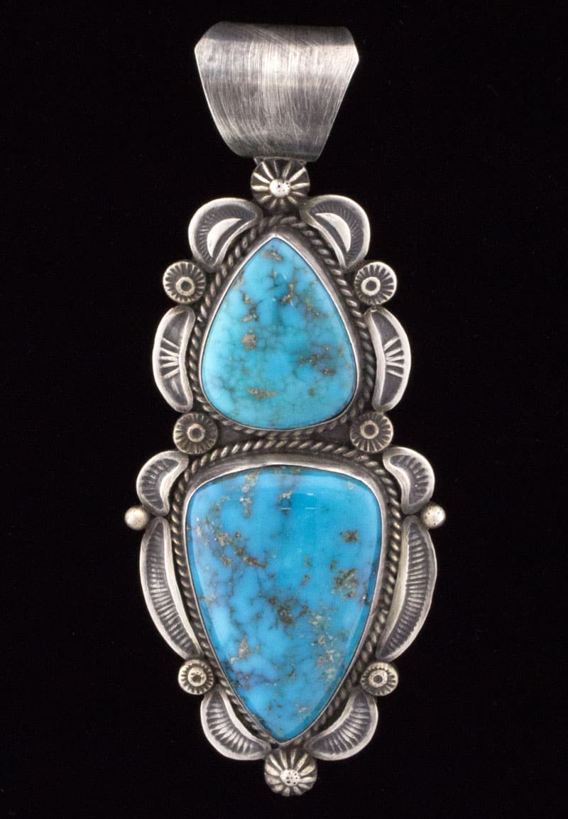 Sterling Silver Pendant  Set With 2 High Grade Natural Kingman Iron Mine Turquoise Stones Mined And Cut Circa The 1970's Period.  These Turquoise Stones Were Derived From An Extinct Mine Located In The Kingman, Arizona Area.  Masterfully Handmade And Designed By Navajo Artist ELLA M. LINKIN.