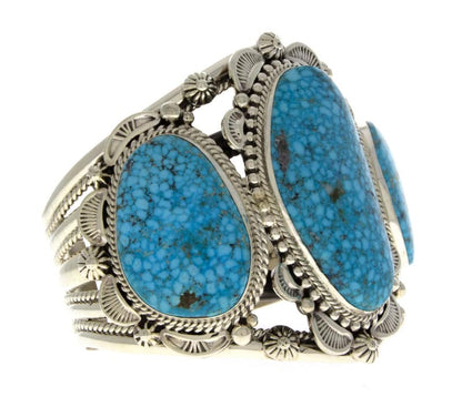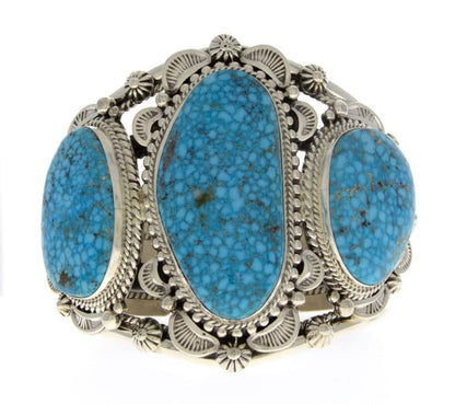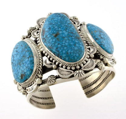 Sterling Silver Bracelet Set With A Row Of 3 Impressive High Grade Natural Kingman Water Web Turquoise Stones Mined Circa The 1980's Period. Masterfully Handmade And Designed By Navajo Artist ELLA M. LINKIN.