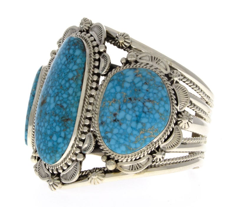 High Grade Natural Kingman Water Web Turquoise 3-Stone Row Bracelet