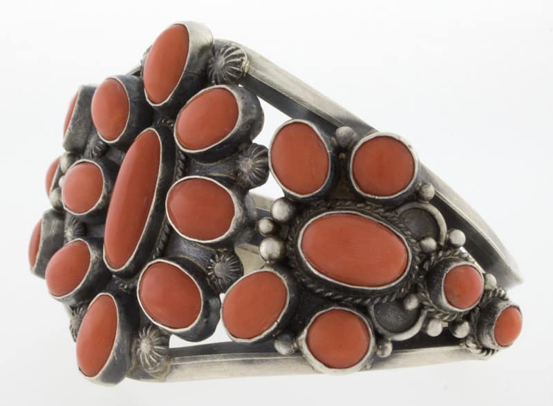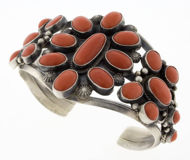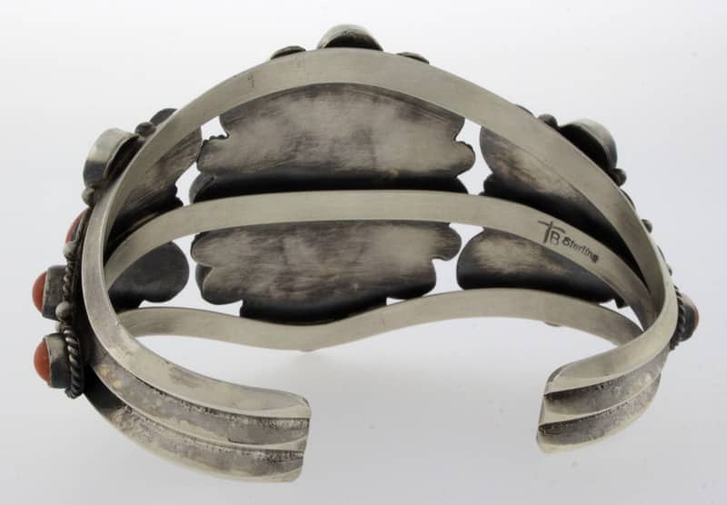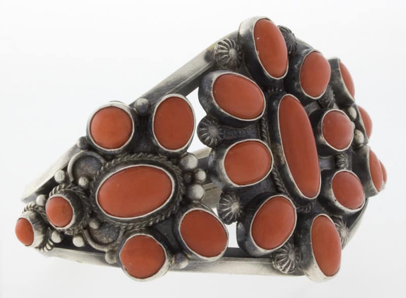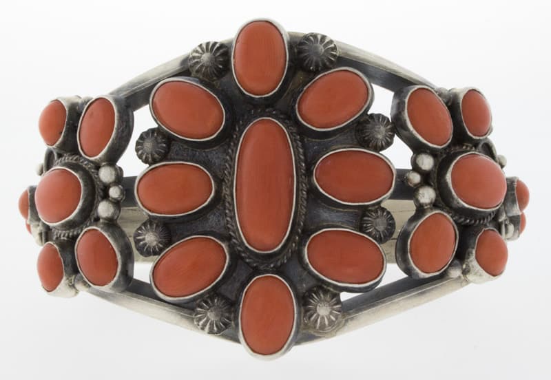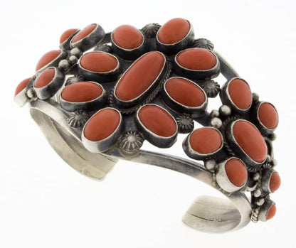 Sterling Silver Bracelet Set With A Cluster Of High Grade Natural Mediterranean Coral Stones. Masterfully Handmade And Designed By Navajo Artist TYLER BROWN.