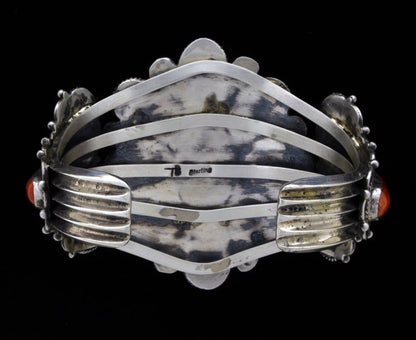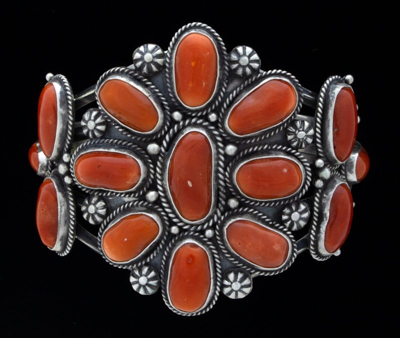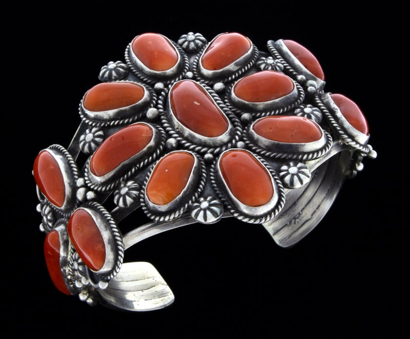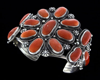 "Old Style" Sterling Silver Bracelet Set With A Cluster Of 15 High Grade Natural Momo Coral Stones Harvested From The Pacific Ocean Circa The 1970's Period.  Masterfully Handmade And Designed By Navajo Artist TYLER BROWN.