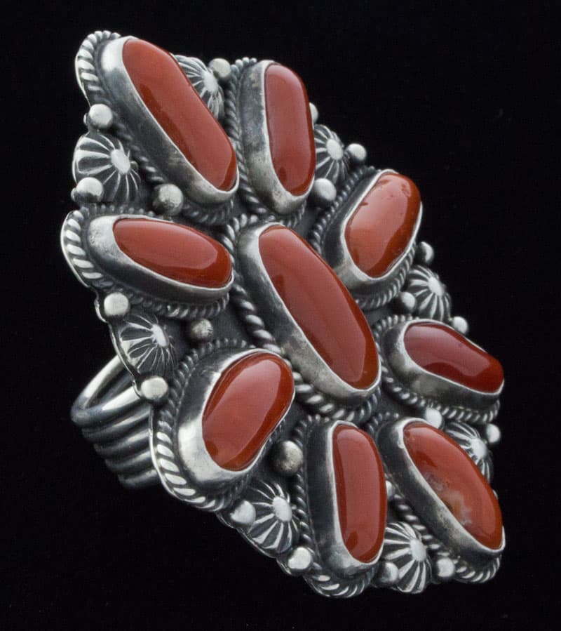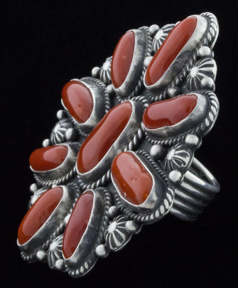 Size 8.25 "Old Style" Sterling Silver Ring Set With A Cluster Of High Grade Natural Momo Coral Stones Harvested From The Pacific Ocean Circa The 1970's Period.  Masterfully Handmade And Designed By Navajo Artist TYLER BROWN.