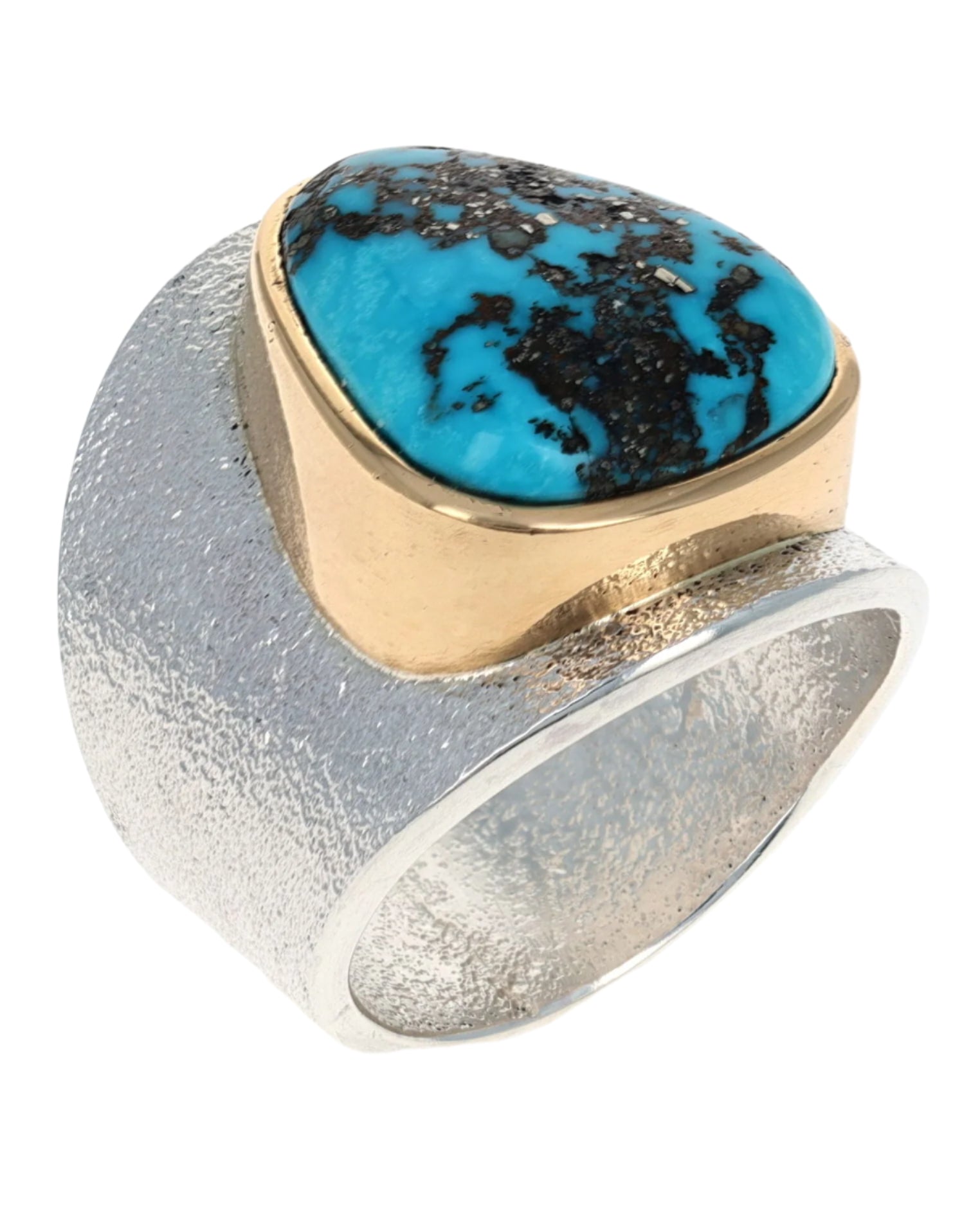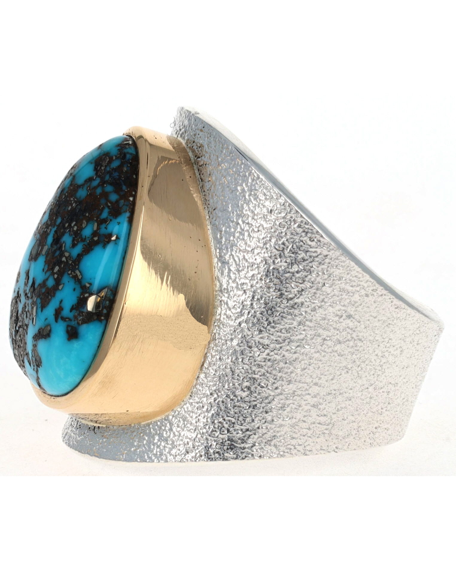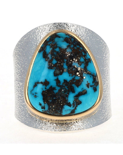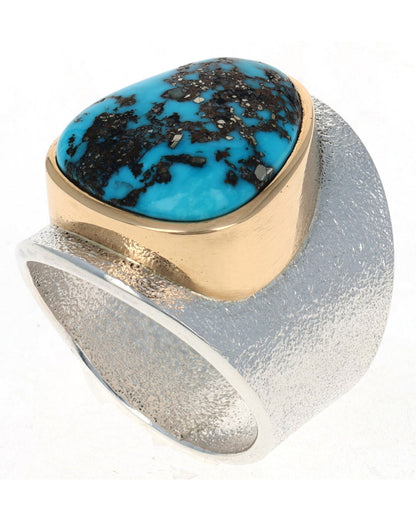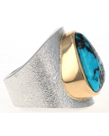 Size 12.5 Tufa Cast Sterling Silver Ring Set With A High Grade Natural Morenci Turquoise Stone Secured In An 18k Gold Bezel.  Masterfully Handmade And Designed By Navajo Artist DARRYL DEAN BEGAY.
