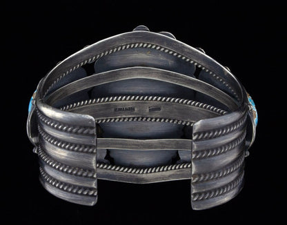 "Old Style" Sterling Silver Bracelet Set With A Distinctive Row Of 3 High Grade Natural Pilot Mountain Turquoise Stones (130 carats) Mined Circa The Late 1960's To Early 1970's Period.  Masterfully Handmade And Designed By Navajo Artist ELLA M. LINKIN.