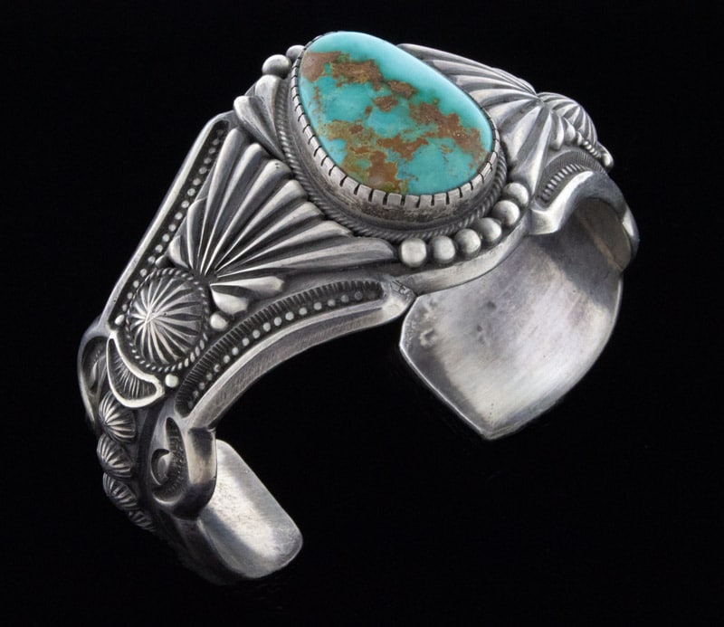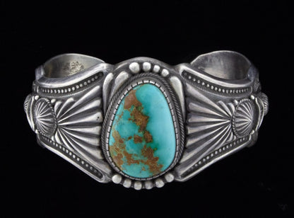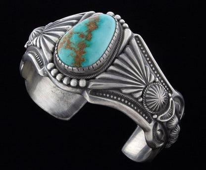 "Old Style" Heavy Gauge Sterling Silver Ingot Bracelet Set With An Impressive High Grade Natural Royston Turquoise Stone.  Masterfully Handmade And Designed By Navajo Artist HARRY H. BEGAY.