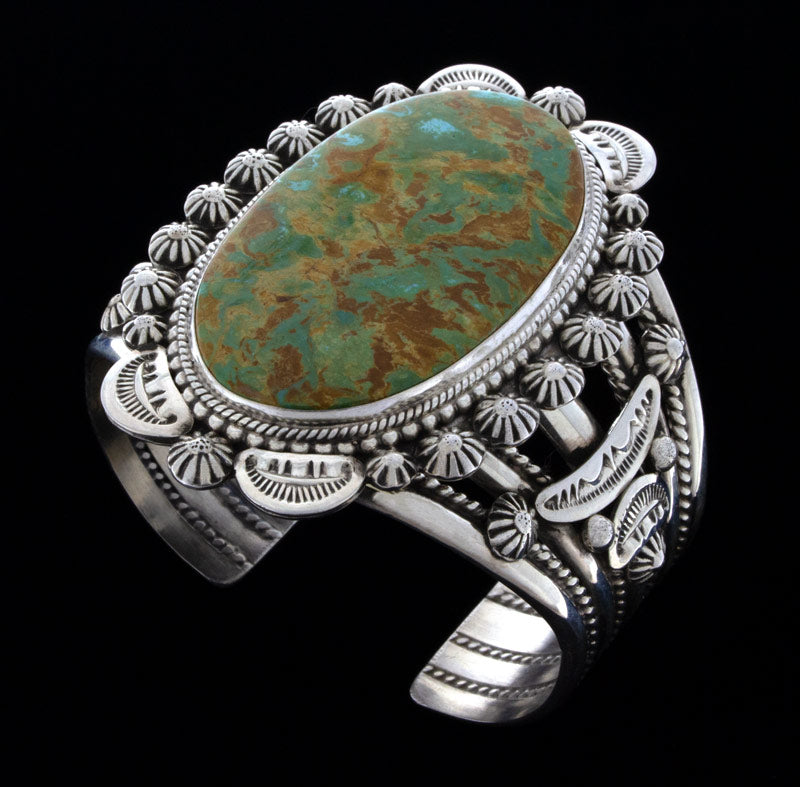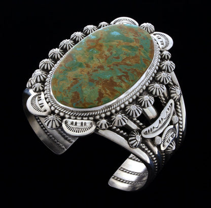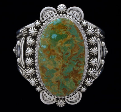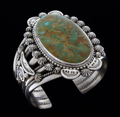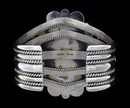 Sterling Silver Bracelet Set With An Impressive Large Oval Shaped High Grade Natural Royston Turquoise Stone Mined Circa The Late 1960's To Early 1970's Period. Masterfully Handmade And Designed By Navajo Artist LUCINDA LINKIN.