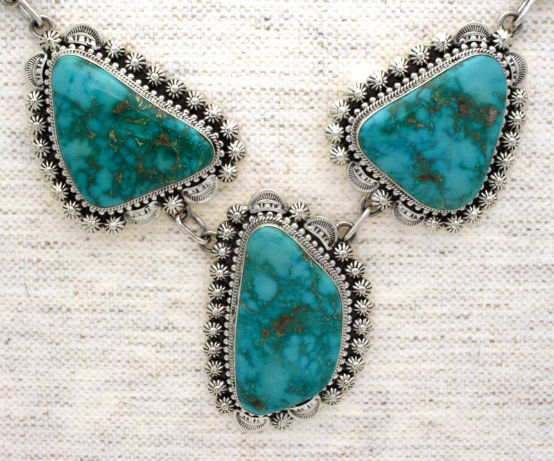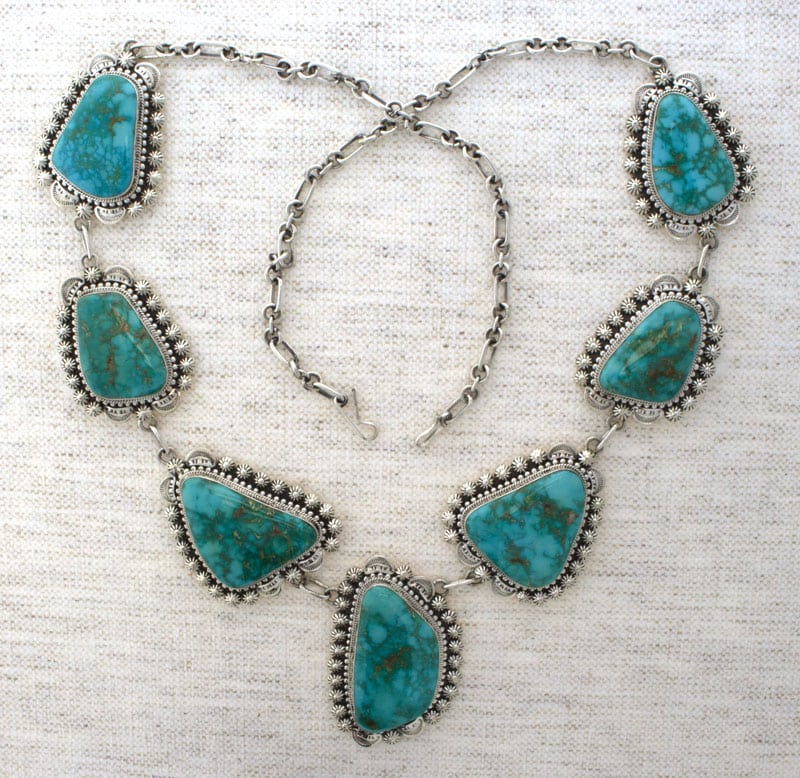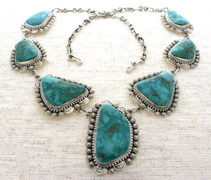 20"- 37.5" Adjustable Length Sterling Silver Link Chain Necklace Set With 7 Impressive High Grade Natural Turquoise Mountain Turquoise Stones Mined Circa The 1970's Period.  Includes A Unique Double Hook Connector Design To Foster Equal Distribution And Balance Of Necklace.  Fully Handmade And Designed By Navajo Artist LUCINDA LINKIN.