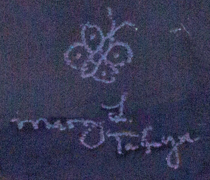 • Artist Hallmark:   "Mary L. Tafoya" (inscribed on the jet back side of each of the 3 multi-stone inlay tabs with artist's personal butterfly insignia)