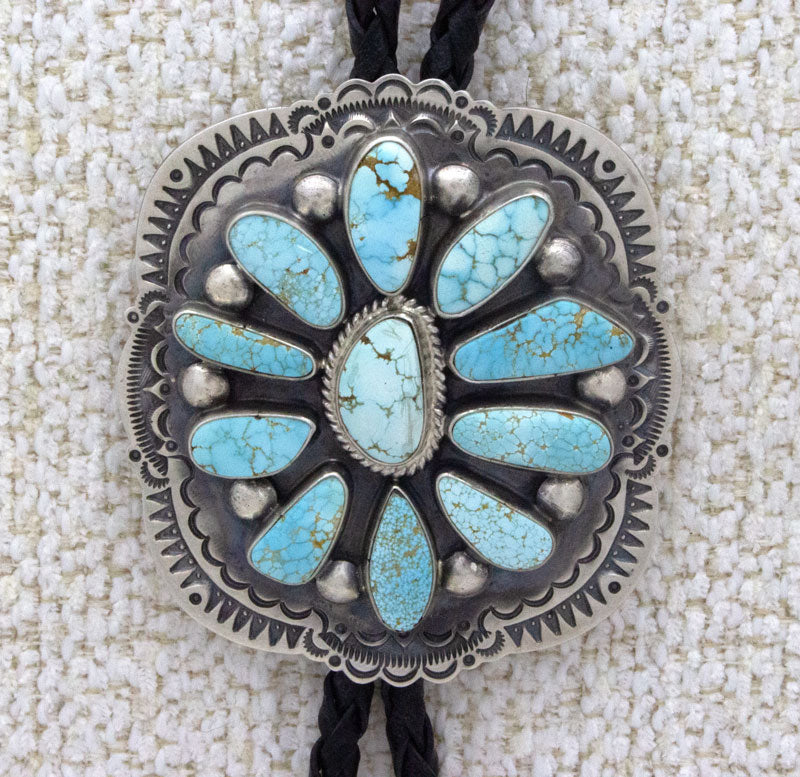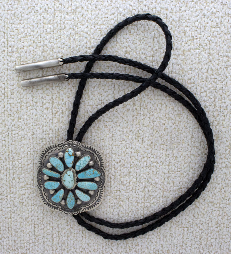 "Old Style" Sterling Silver Bolo Tie Set With A Cluster Of 11 Natural #8 Turquoise Stones.  Hung On A 42" Hand Braided 4-Ply Leather Cord With Sterling Silver Tips.  Bolo & Tips Masterfully Handmade And Designed By Navajo Artist ROLAND DIXSON.