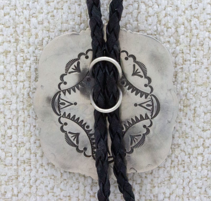 • Artist Hallmark:  "Roland Dixson" (hand stamped on back side of bolo covered by leather cord)