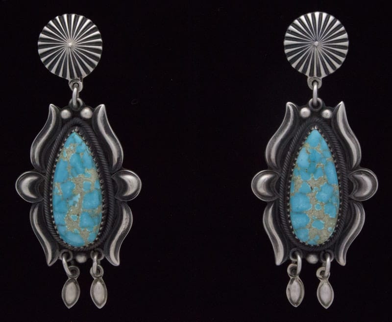 "Old Style" Sterling Silver Earrings Each Set With An Elongated Teardrop Shaped RARE Natural #8 Turquoise Stone. Masterfully Handmade And Designed By Navajo Artist DELBERT GORDON.