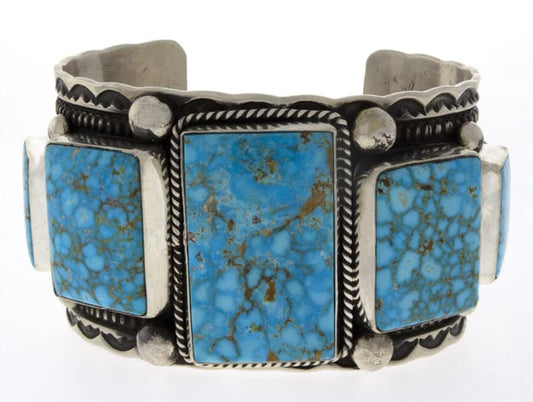 "Old Style" Heavy Gauge Sterling Silver Bracelet Set With A Row Of 5 Natural Birdseye Kingman Turquoise Stones. Masterfully Handmade And Designed By Navajo Artist GUY HOSKIE.