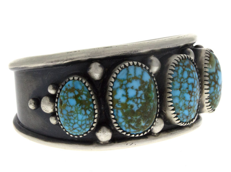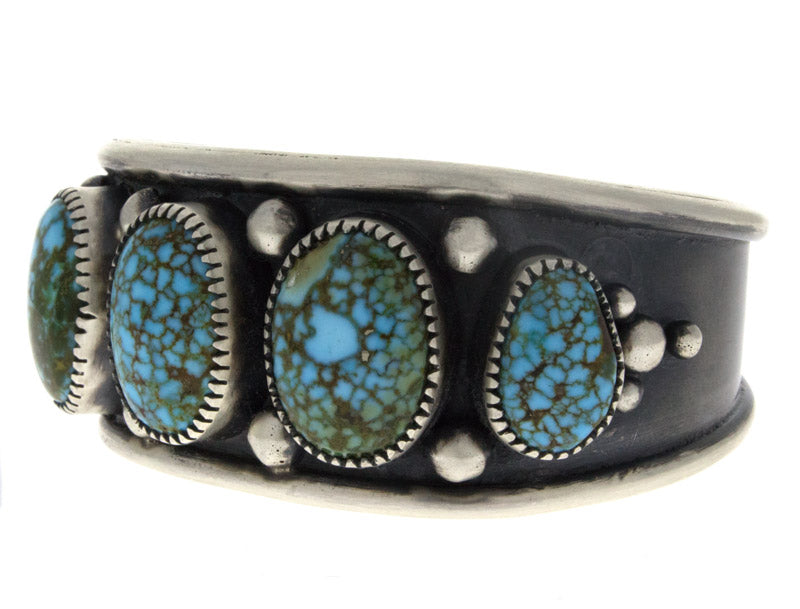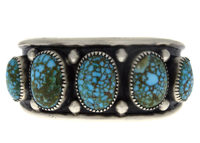 "Old Style" Sterling Silver Bracelet Set With A Row 5 Natural Birdseye Kingman Turquoise Stones.  Masterfully Handmade And Designed By Navajo Artist AKEE DOUGLAS.