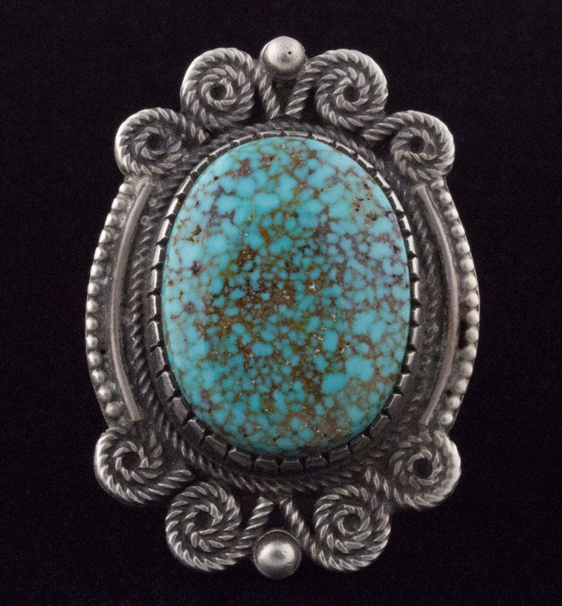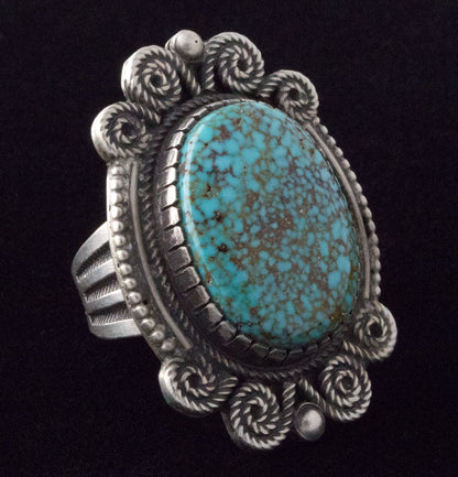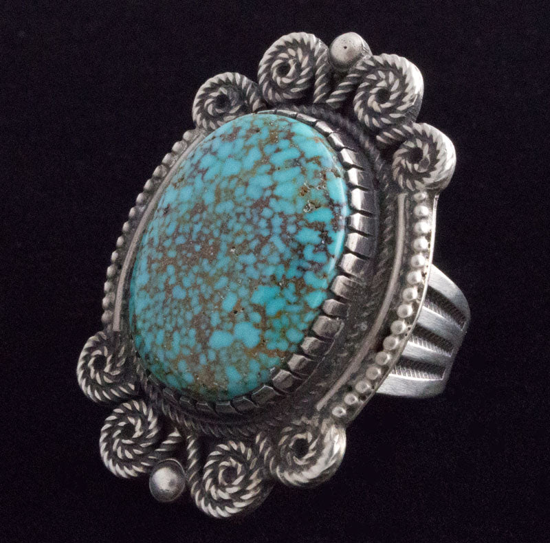 Size 8.25 "Old Style" Ingot Sterling Silver Ring Set With A Natural Birdseye Kingman Turquoise Stone. Masterfully Handmade And Designed By Navajo Artist CALVIN MARTINEZ.