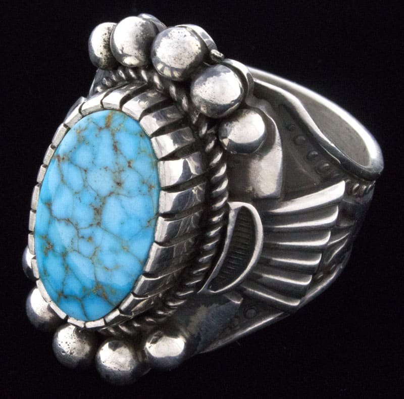 Size 12.75 "Old Style" Sterling Silver Ring Set With A Natural Birdseye Kingman Turquoise Stone.  Masterfully Handmade By Navajo Artist ALBERT JAKE.