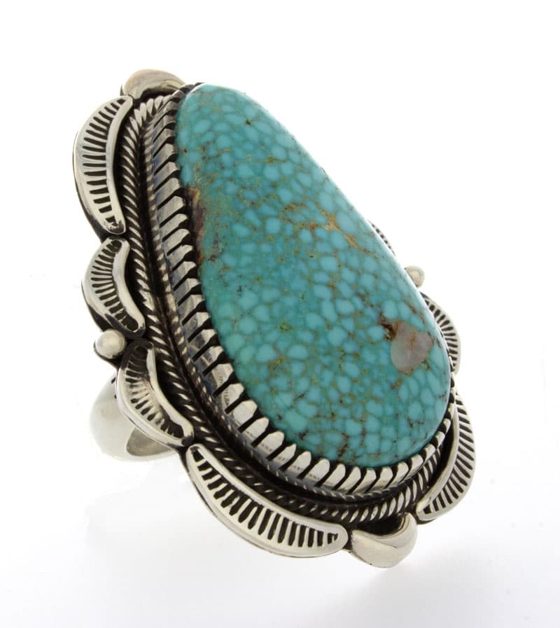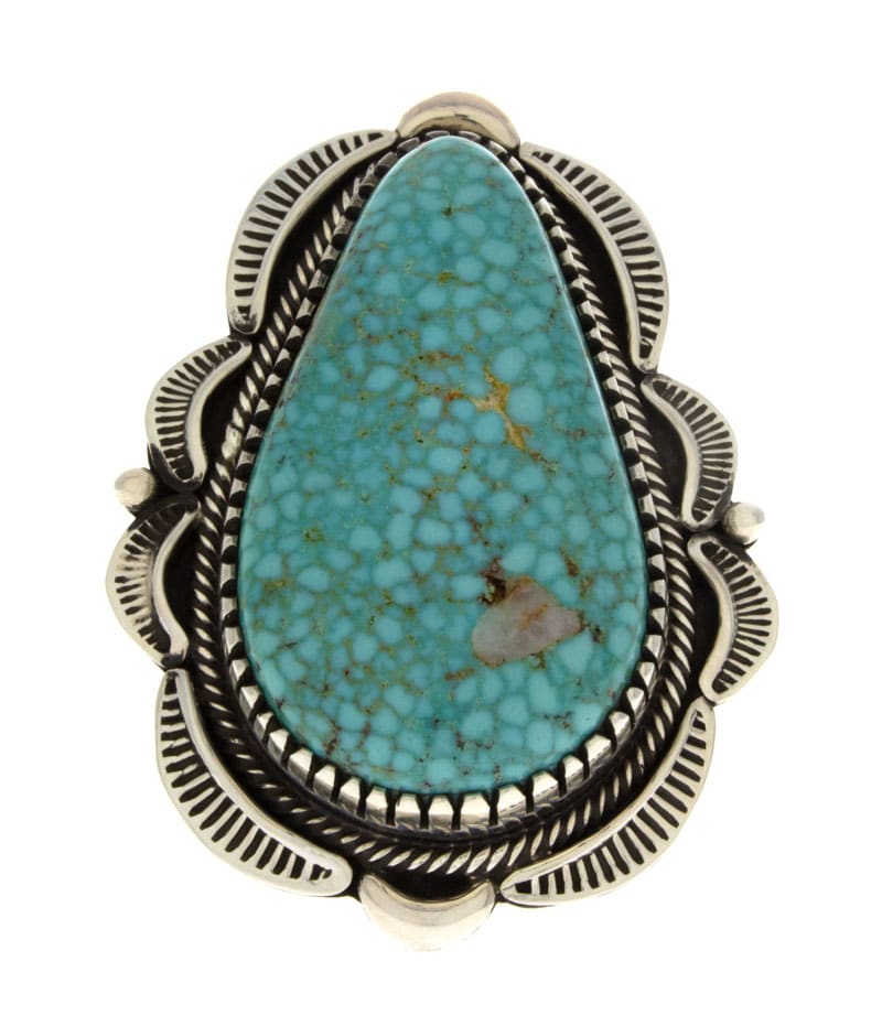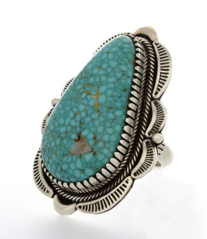Size 9  Sterling Silver Statement Ring Set With A Large Teardrop Cut Natural Birdseye Kingman Turquoise Stone.  Masterfully Handmade And Designed By Navajo Artist MURPHY PLATERO.