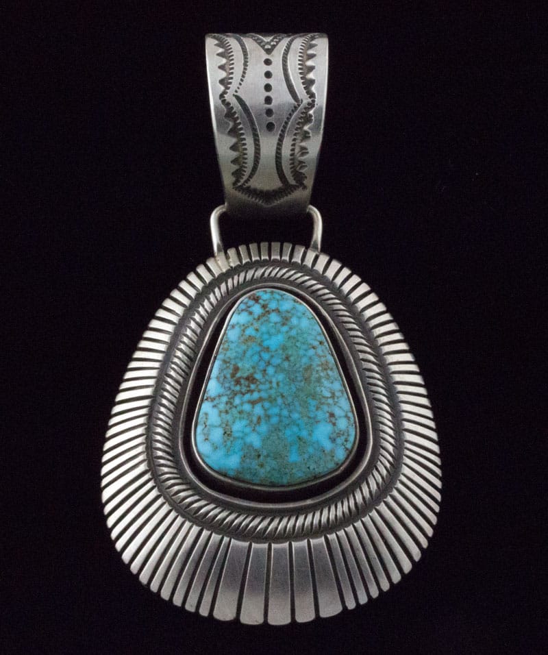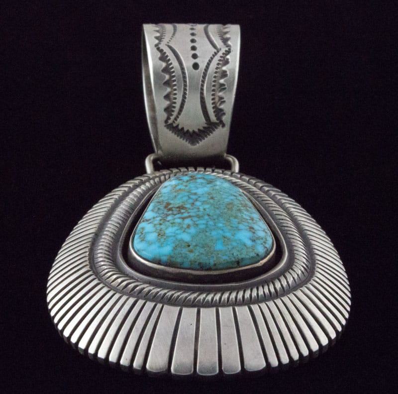 "Old Style" Ingot Sterling Silver Shadowbox Pendant Set With A Natural Birdseye Kingman Turquoise Stone.  Masterfully Handmade And Designed By Navajo Artist CALVIN MARTINEZ.