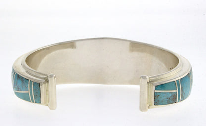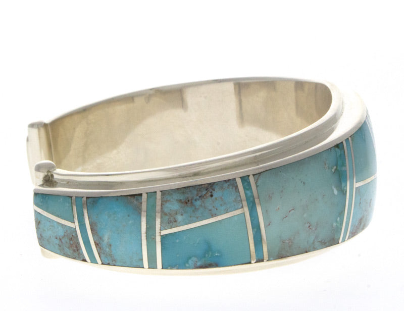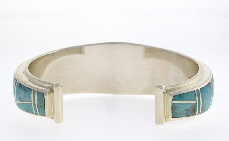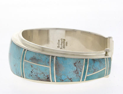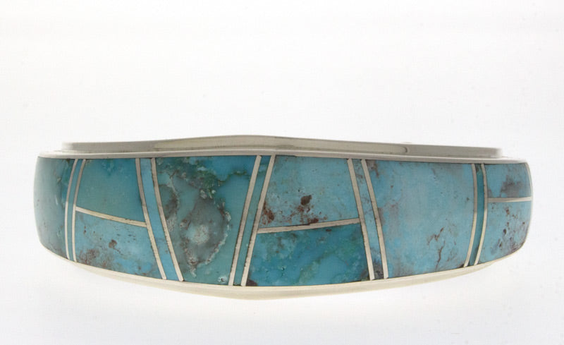 Sterling Silver Bracelet Set With A Channel Inlay Design Of RARE Natural Bisbee Turquoise Stones.  Masterfully Handmade And Designed By Navajo Artist JULIUS BURBANK.
