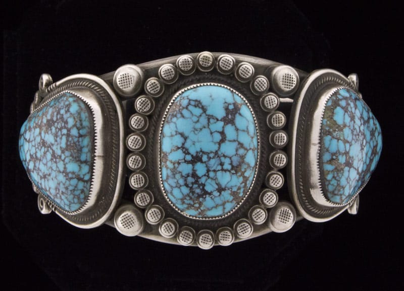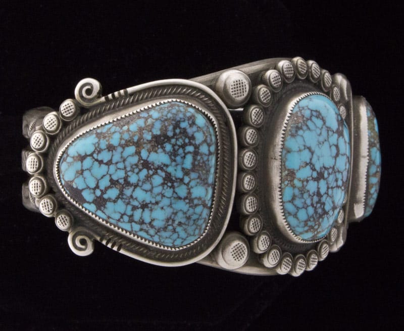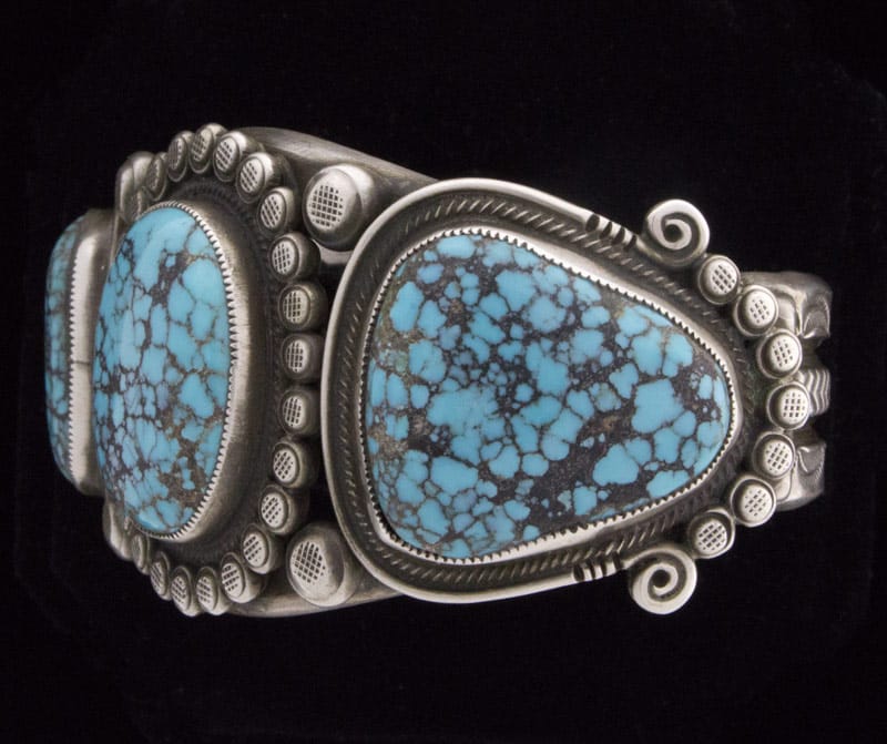 "Old Style" Ingot Sterling Silver Bracelet Set With A Row of 3 Natural Black Web Kingman Turquoise Stones.  Masterfully Handmade And Designed By Navajo Artist CALVIN MARTINEZ.