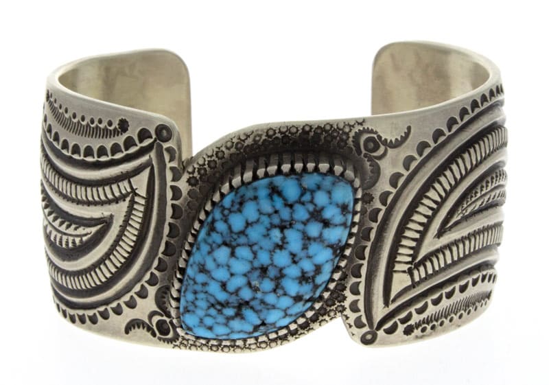 "Old Style" Ingot Sterling Silver Bracelet Set With A Natural Black Web Kingman Turquoise Stone.  Masterfully Handmade And Designed By Navajo Artist CALVIN MARTINEZ.