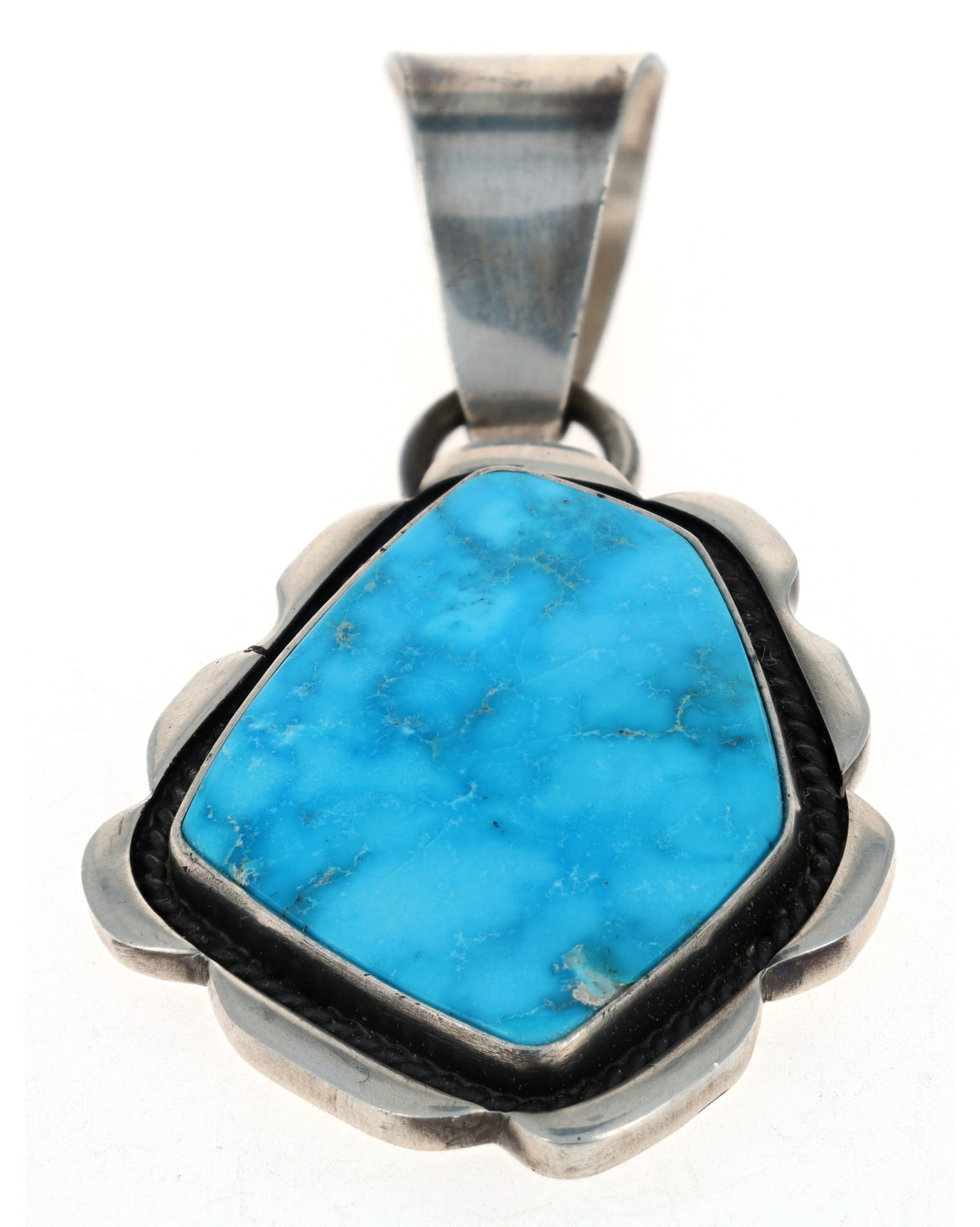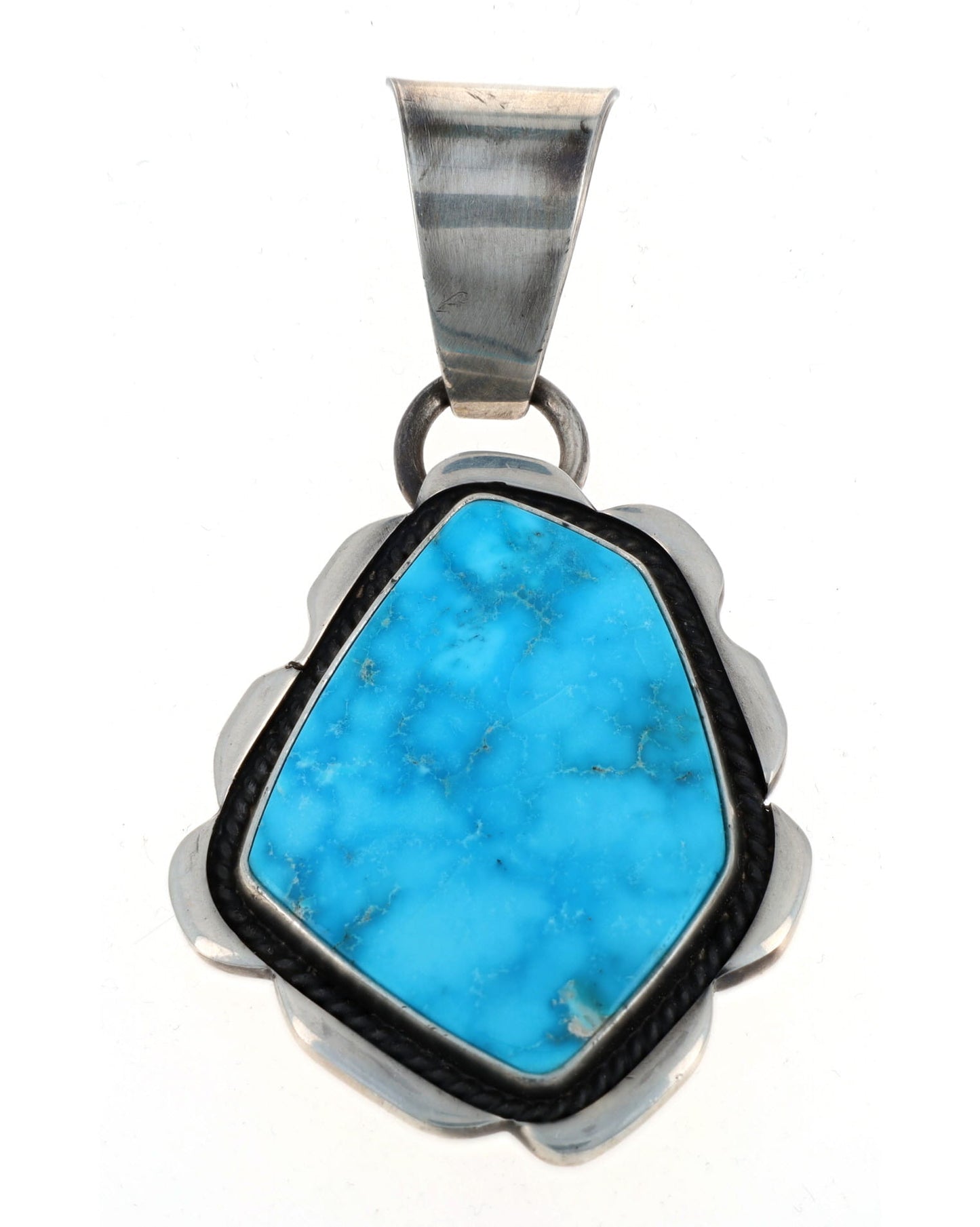"Old Style" Sterling Silver Pendant Set With A RARE Natural Blue Gem Turquoise Stone. Masterfully Handmade And Designed By Navajo Artist VERDY JAKE.