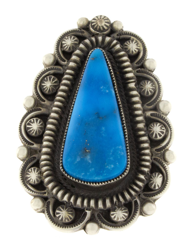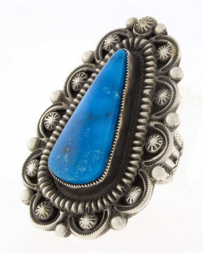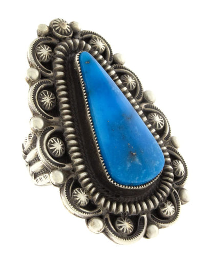 Size 8.75 Heavy Gauge "Old Style" Ingot Sterling Silver Statement Ring Set With A Large Teardrop Shaped Natural Blue Moon Turquoise Stone.  Masterfully Handmade And Designed By Navajo Artist CALVIN MARTINEZ.