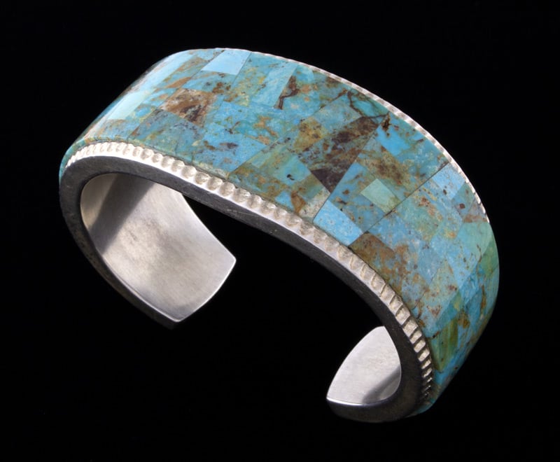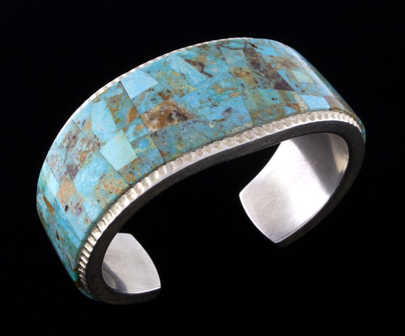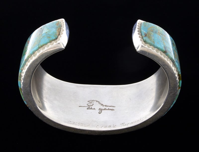 Sterling Silver Ingot Bracelet With An Impressive Stone On Stone Inlay Design Of Natural Cripple Creek Turquoise.  Masterfully Handmade And Designed By Navajo Artist ALVIN YELLOWHORSE.