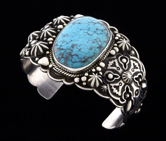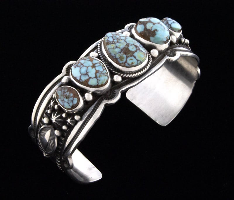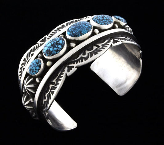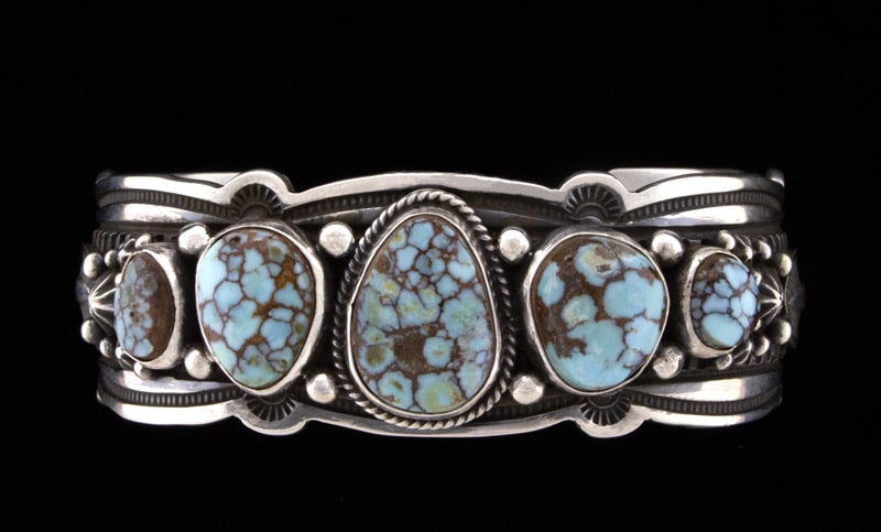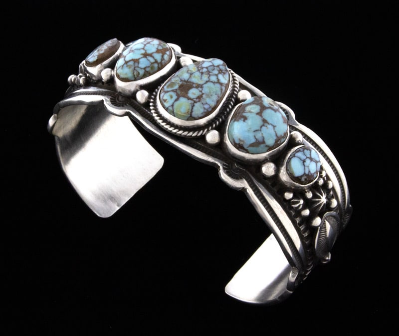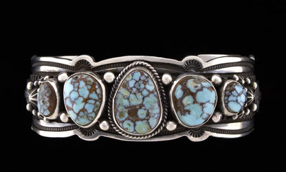 "Old Style" Sterling Silver Bracelet Set With A Row Of 5 Natural Dry Creek Turquoise Stones.  Masterfully Handmade And Designed By Navajo Artist HAPPY PIASSO.