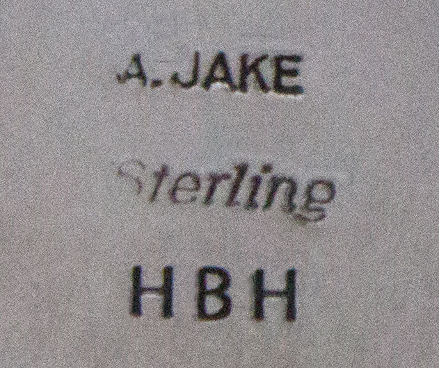 • Artist Hallmarks:   "A. JAKE, HBH" (denoting "Heavy By Hand" design) - hand stamped on back side of pendant.