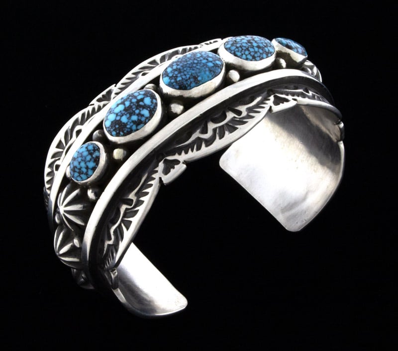 "Old Style" Sterling Silver Bracelet Set With A Row Of 5 Natural Kingman Black Web Turquoise Stones. Masterfully Handmade And Designed By Navajo Artist HAPPY PIASSO.