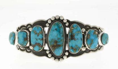"Old Style" Sterling Silver Row Bracelet Set With A Row Of 7 Natural Kingman Turquoise Stones. Masterfully Handmade And Designed By Navajo Artist AARON TOADLENA.