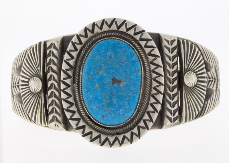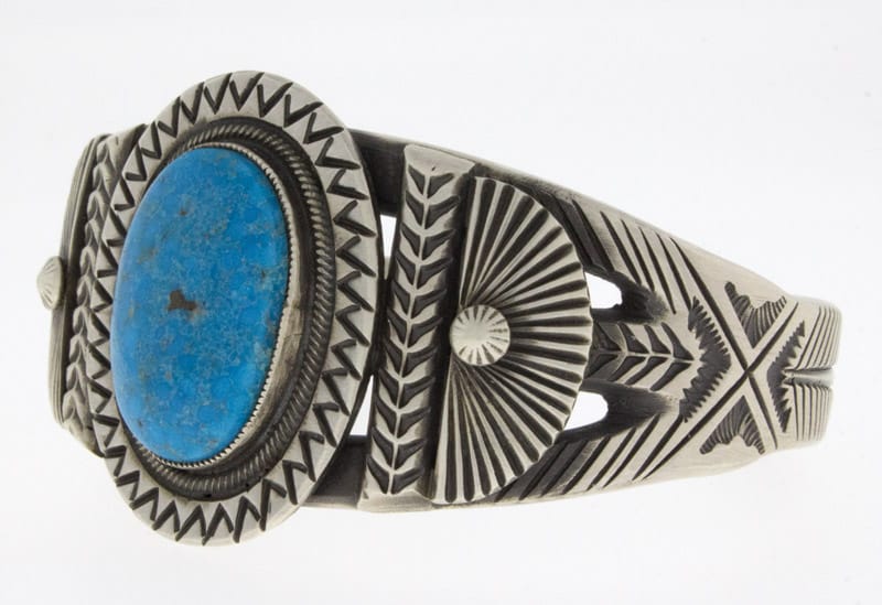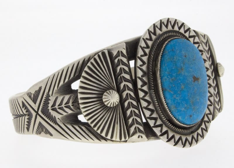 "Old Style" Ingot Sterling Silver Bracelet Set With A Natural Kingman Turquoise Stone.  Masterfully Handmade And Designed By Navajo Artist CALVIN MARTINEZ.