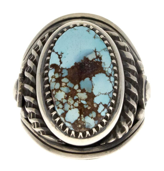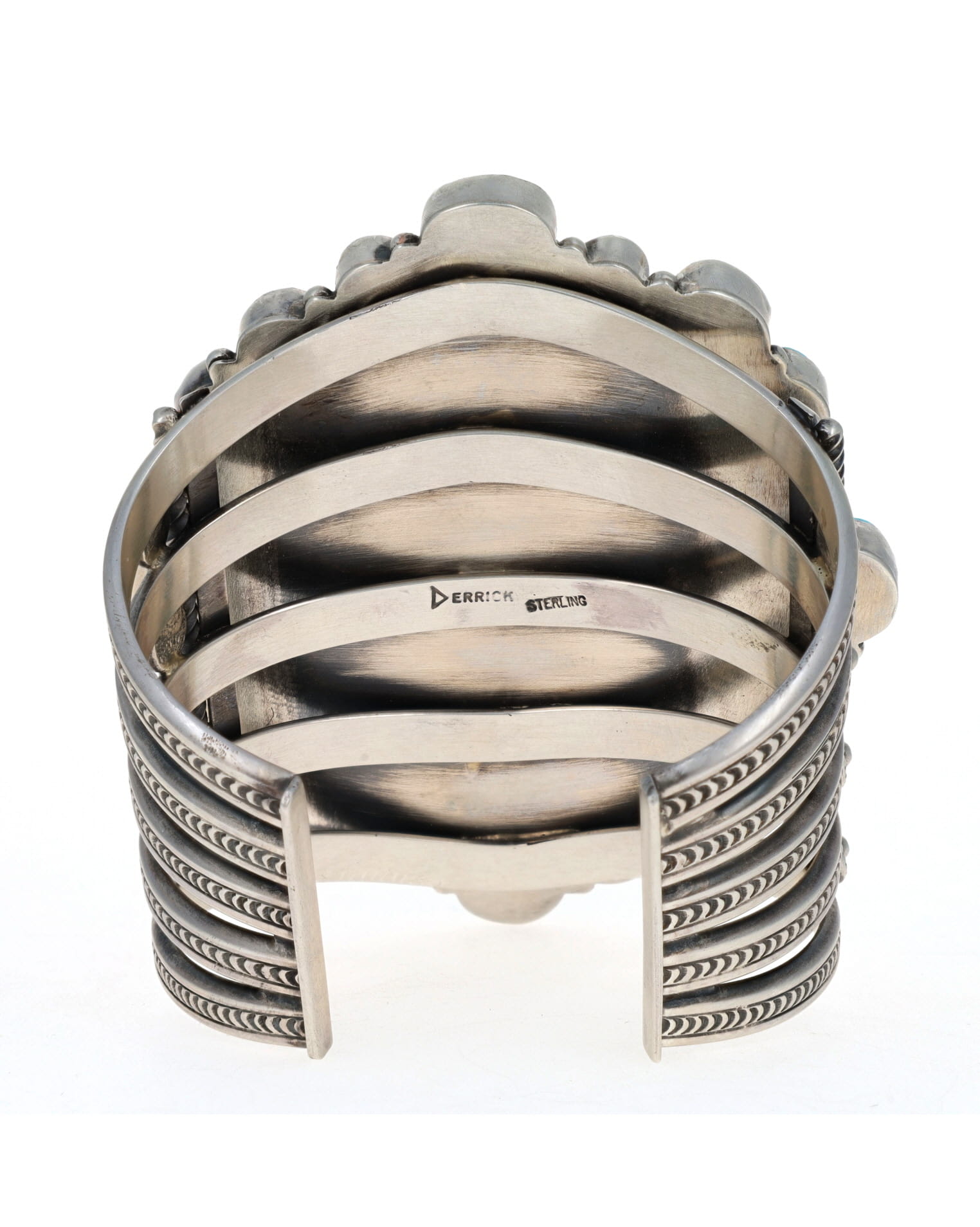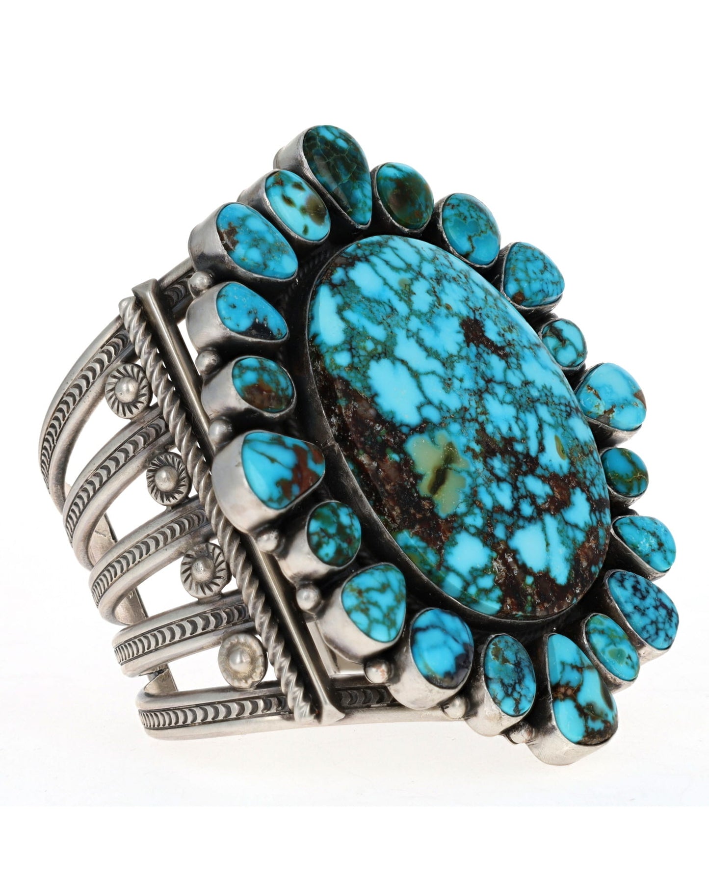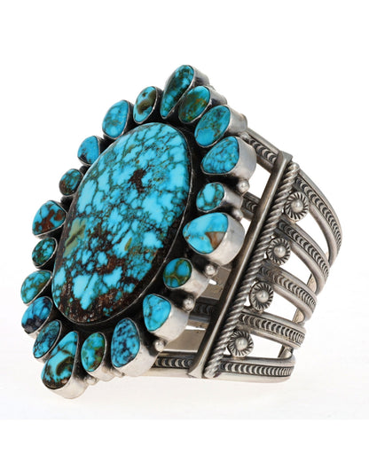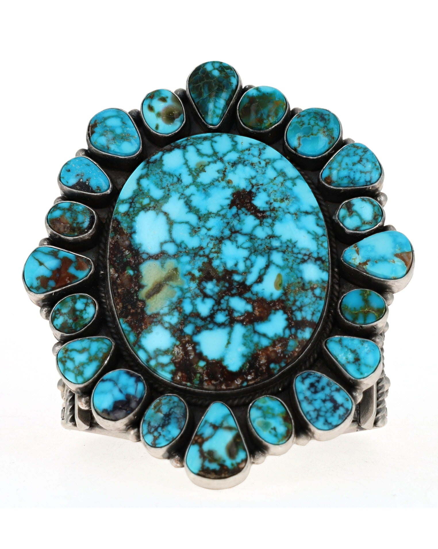 "Old Style" Sterling Silver Bracelet Set With An Impressive Natural Kingman Turquoise Center Stone And Complimented With A Cluster Surround Of 20 Smaller Natural Kingman Turquoise Stones. Masterfully Handmade And Designed By Navajo Artist DERRICK GORDON.