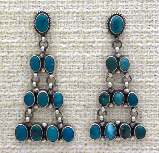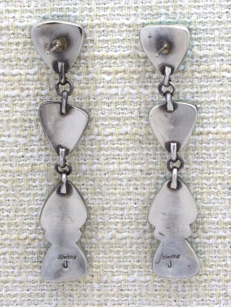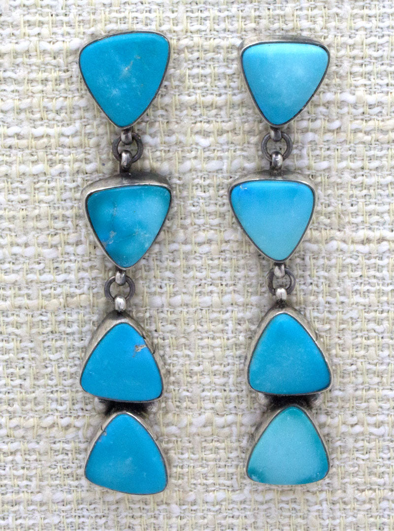 "Old Style" Sterling Silver Post-Dangle Earrings Each Set With 4 Triangular Shaped Natural Kingman Turquoise Stones.  Masterfully Handmade And Designed By Navajo Artist JERRYSON HENIO.
