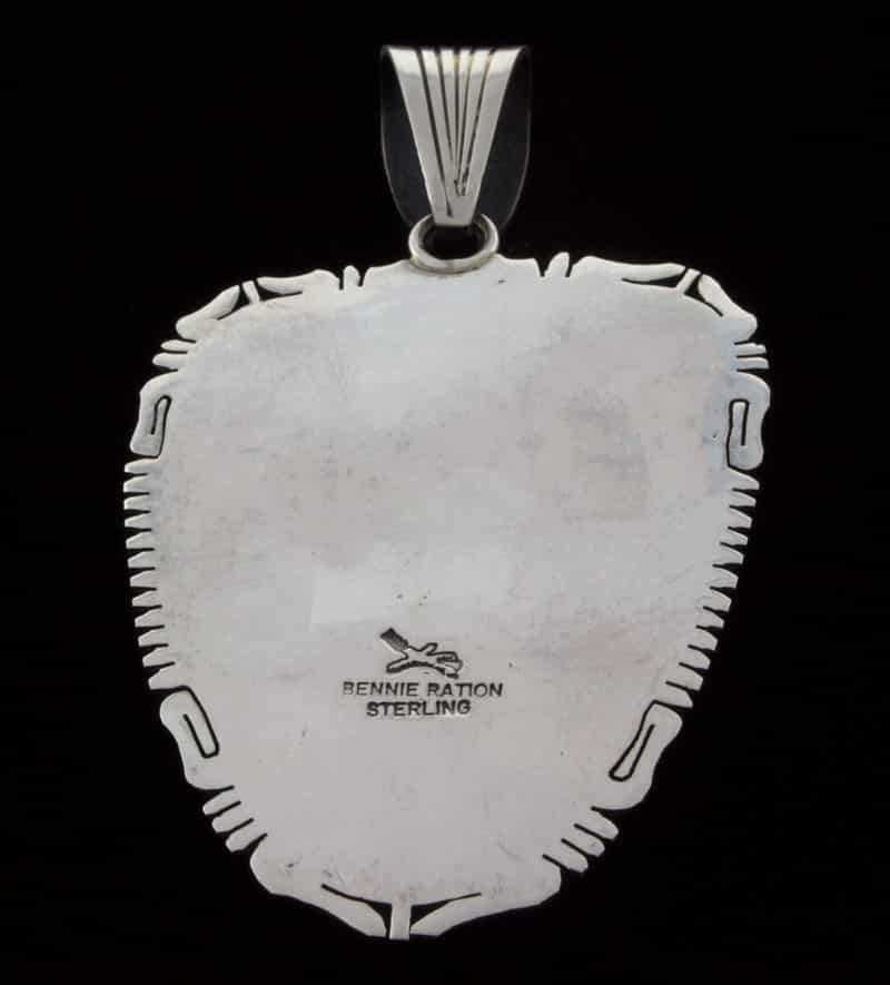 • Artist Hallmark:  "BENNIE RATION" (hand stamped on back side of pendant with artist's personal hawk insignia)