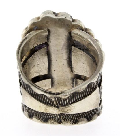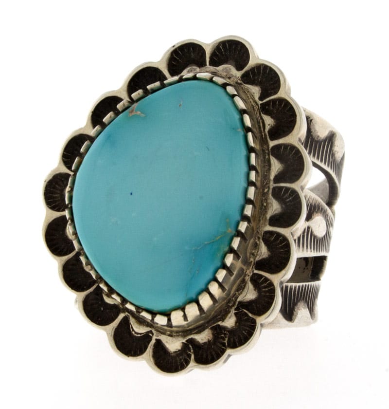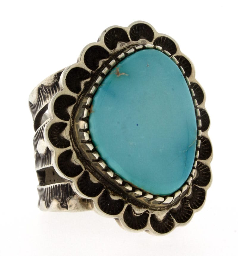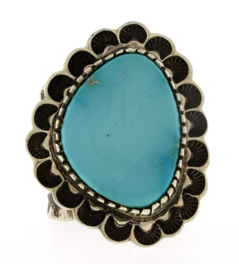 Size 13.25 Sterling Silver "Old Style" Ring Set With An Impressive Natural Kingman Turquoise Stone. Masterfully Handmade And Designed By Deceased Navajo Artist TOMMY JACKSON.