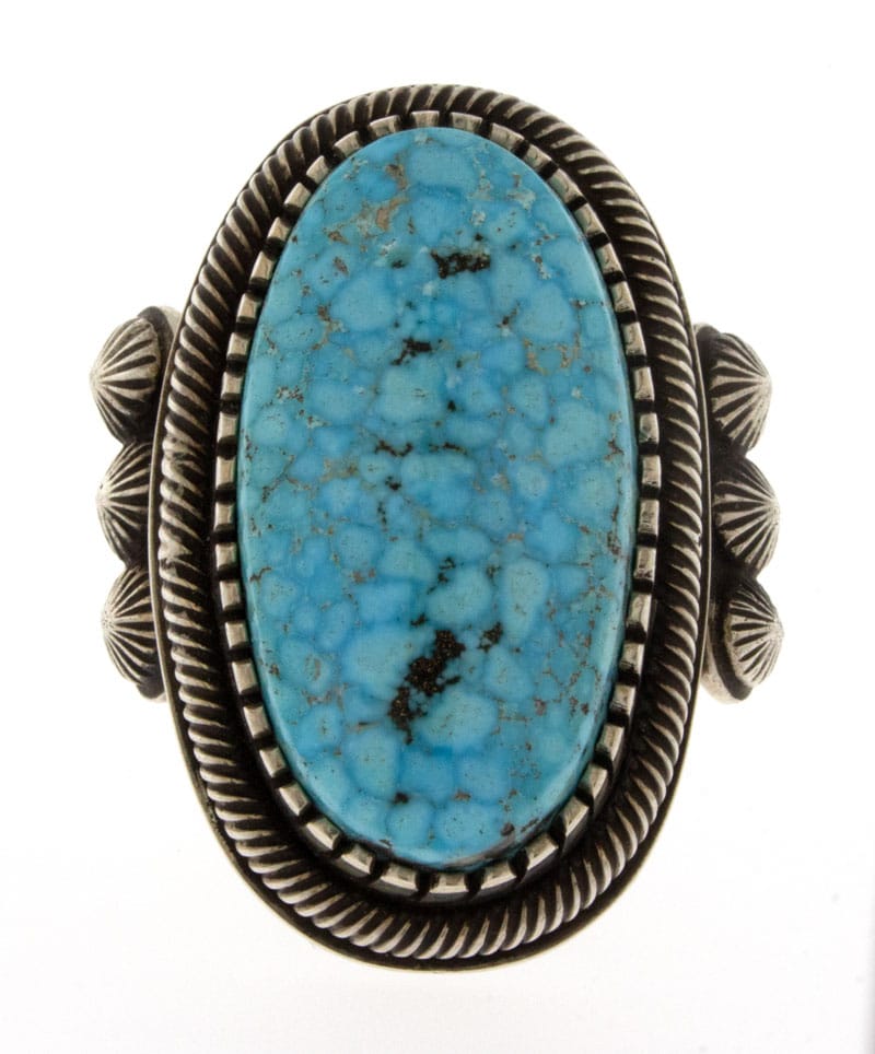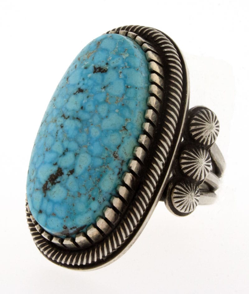 Size 9.25 Sterling Silver "Old Style" Ring Set With A Large Oval Shaped Natural Kingman Turquoise Stone. Masterfully Handmade And Designed By Deceased Navajo Artist TOMMY JACKSON.