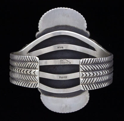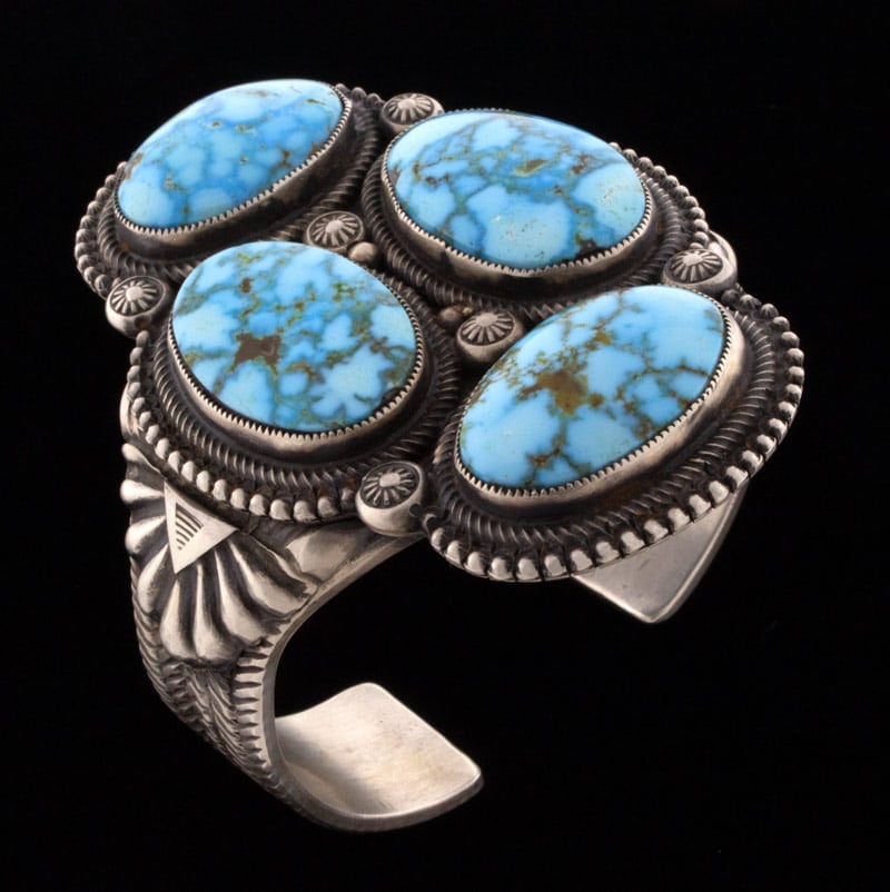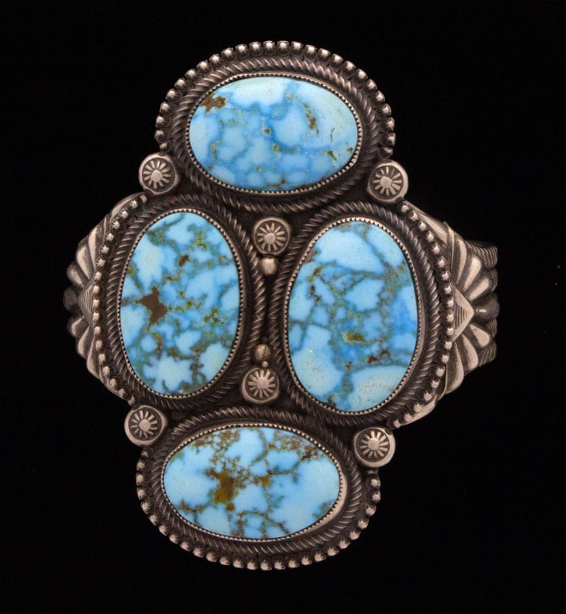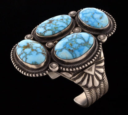 "Old Style" Heavy Gauge Ingot Sterling Silver Bracelet Set With 4 Large Oval Natural Kingman Water Web Turquoise Stones.  Masterfully Handmade And Designed By Navajo Artist CALVIN MARTINEZ.