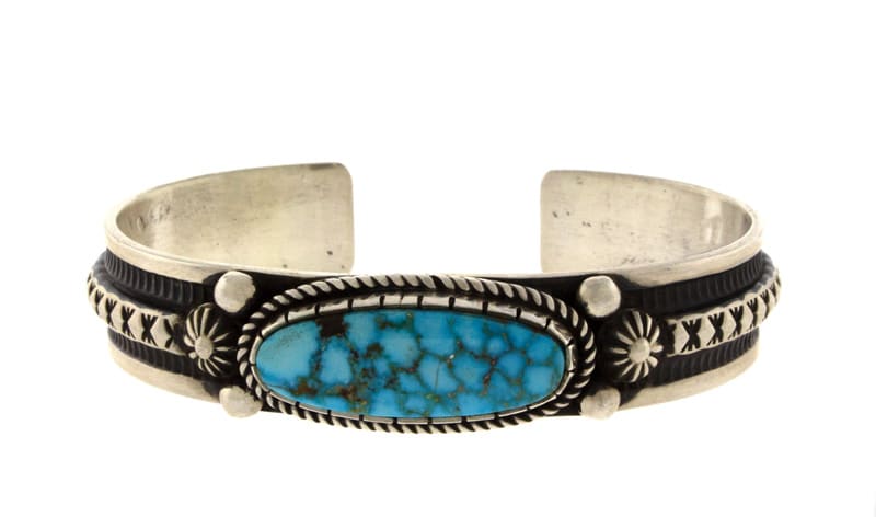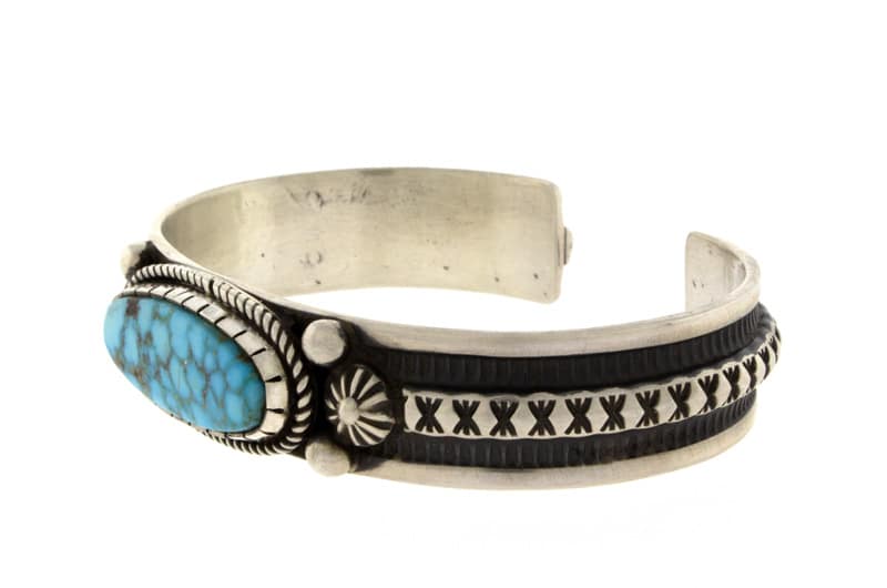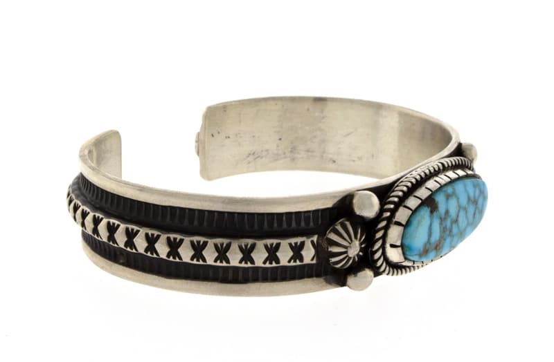 "Old Style" Sterling Silver Bracelet Set With A Natural Kingman Water Web Turquoise Stone. Masterfully Handmade By Navajo Artist ALBERT JAKE.